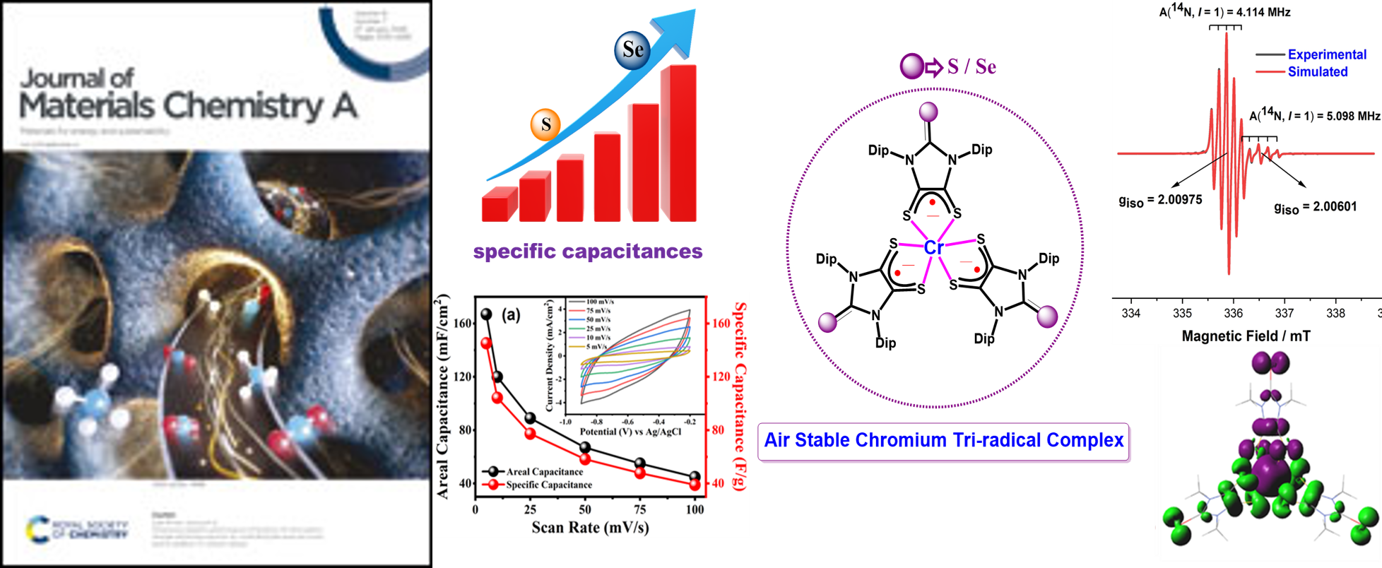 128. Sujit Das, Mayur Thosare, Saurav Ghosh, T. Kedara Shivasharma, Subuhan Ahamed, Harsha S. Karnamkkott, Björn Schwarz,* Babasaheb R. Sankapal,* Liviu, Ungur, Kartik Chandra Mondal.* Air Stable Photo-Redox Active Elusive Cr(III)-Tri-dithiolene-radical Complexes as a New Class of Pseudo-Supercapacitor with High Capacitance: Enhancement of Energy Storage with Heavier Chalcogenide.