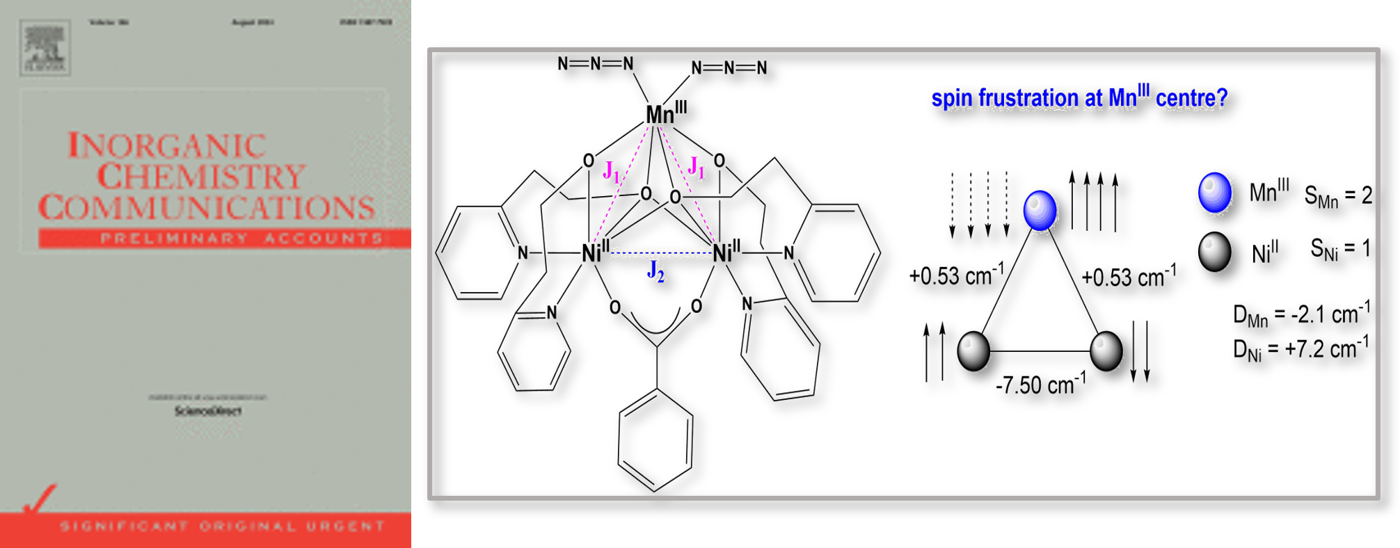 98. Jayasree Kumar, Ibtesham Tarannum, Saurabh Kumar Singh,* Kartik Chandra Mondal.* A Spin Frustrated Azide and Alkoxide Bridged Hetero-bimetallic Mixed Valence MnIIMnIII2NiII4 Disc with S = 17/2 or 19/2.
